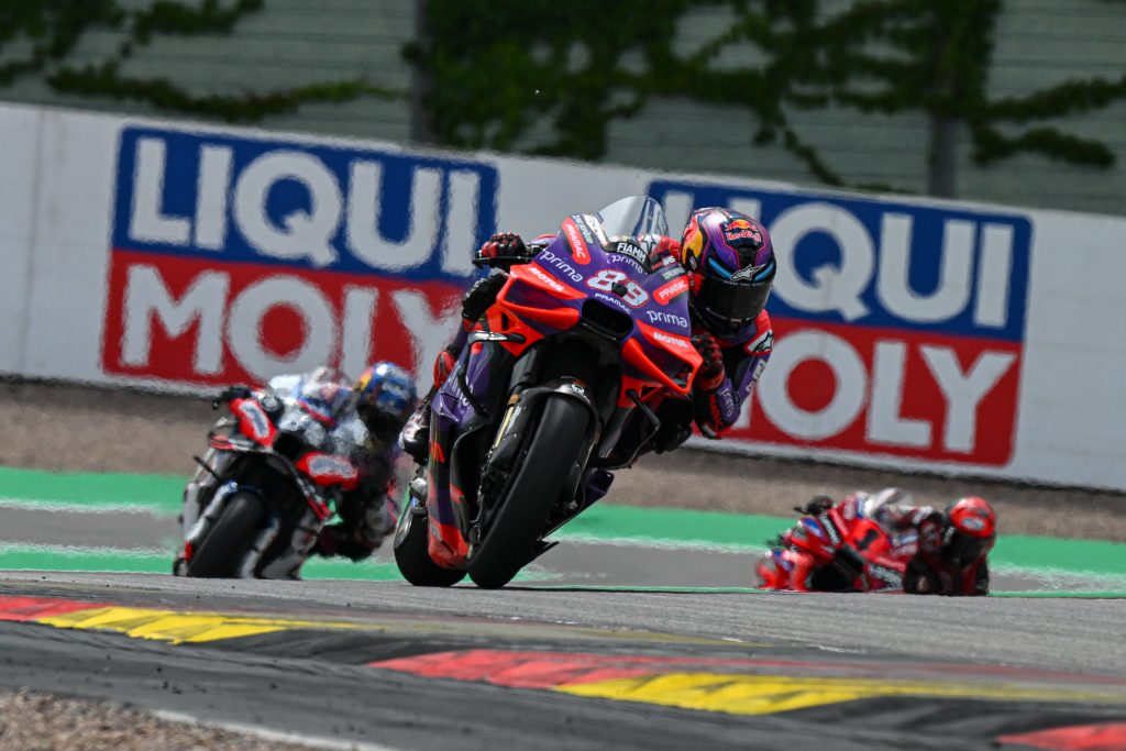 The Sachsenring king was up to seventh when he overtook Raul Fernandez at Turn 13 on Lap 6, despite the Trackhouse Racing pilot’s best efforts to keep him behind, while Bagnaia was already riding on a track limits warning in third place.