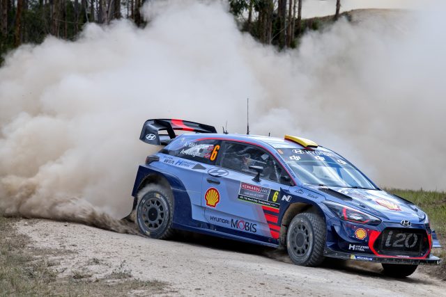 Making use of his lower starting position and swept roads, the Hyundai driver won all three stages to take a 16.6s lead from Citroen’s Kris Meeke.