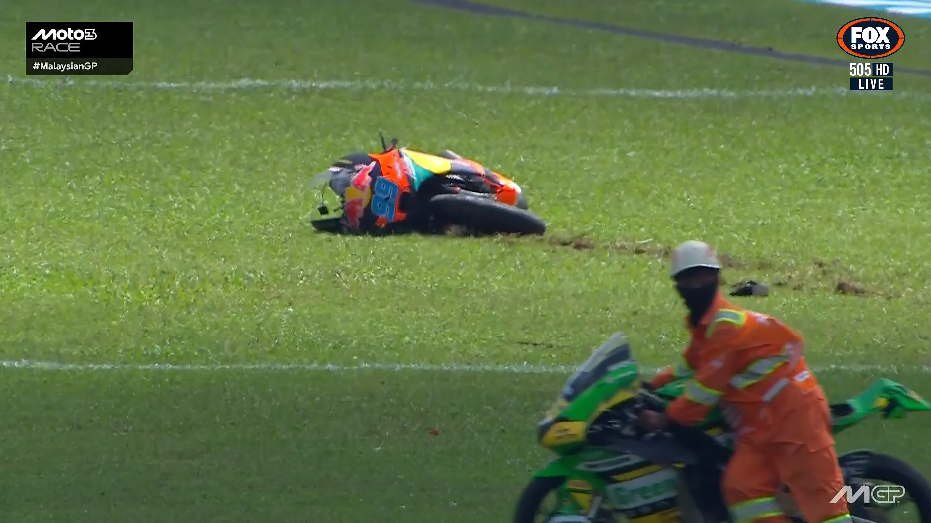 Both riders suffered injuries after a collision on the sighting lap of the Moto3 race at Sepang in Malaysia and were flown to a nearby hospital.