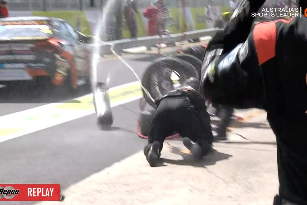 A large canister, to which that water pipe was connected, was then pulled off its mounts and became airborne, shooting above the team member’s head, before landing in the fast lane.