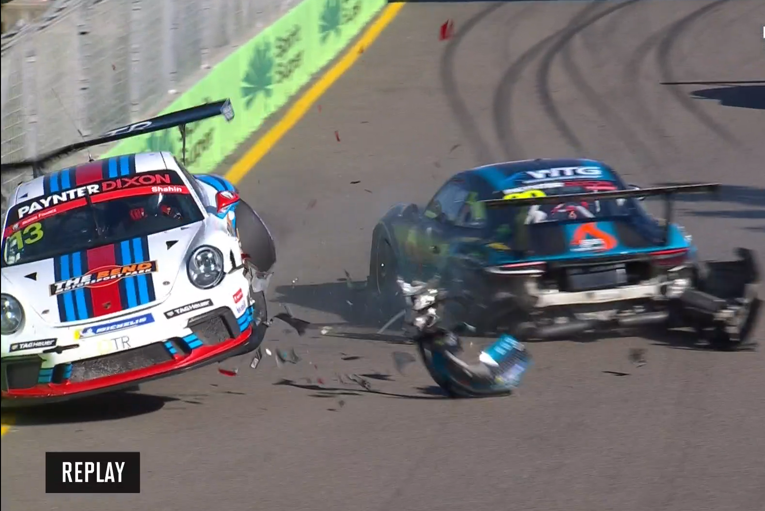 An Adrian Flack mistake exiting Turn 3 on Lap 13 saw him find the fence and career backwards into the oncoming Porsche of Sam Shahin.