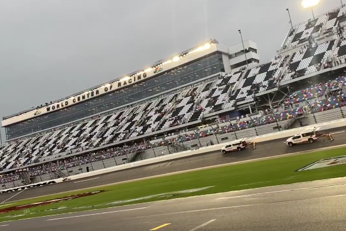 The field had been set to take the green flag at 19:46 ET on Saturday night, but rain and lightning put paid to that.