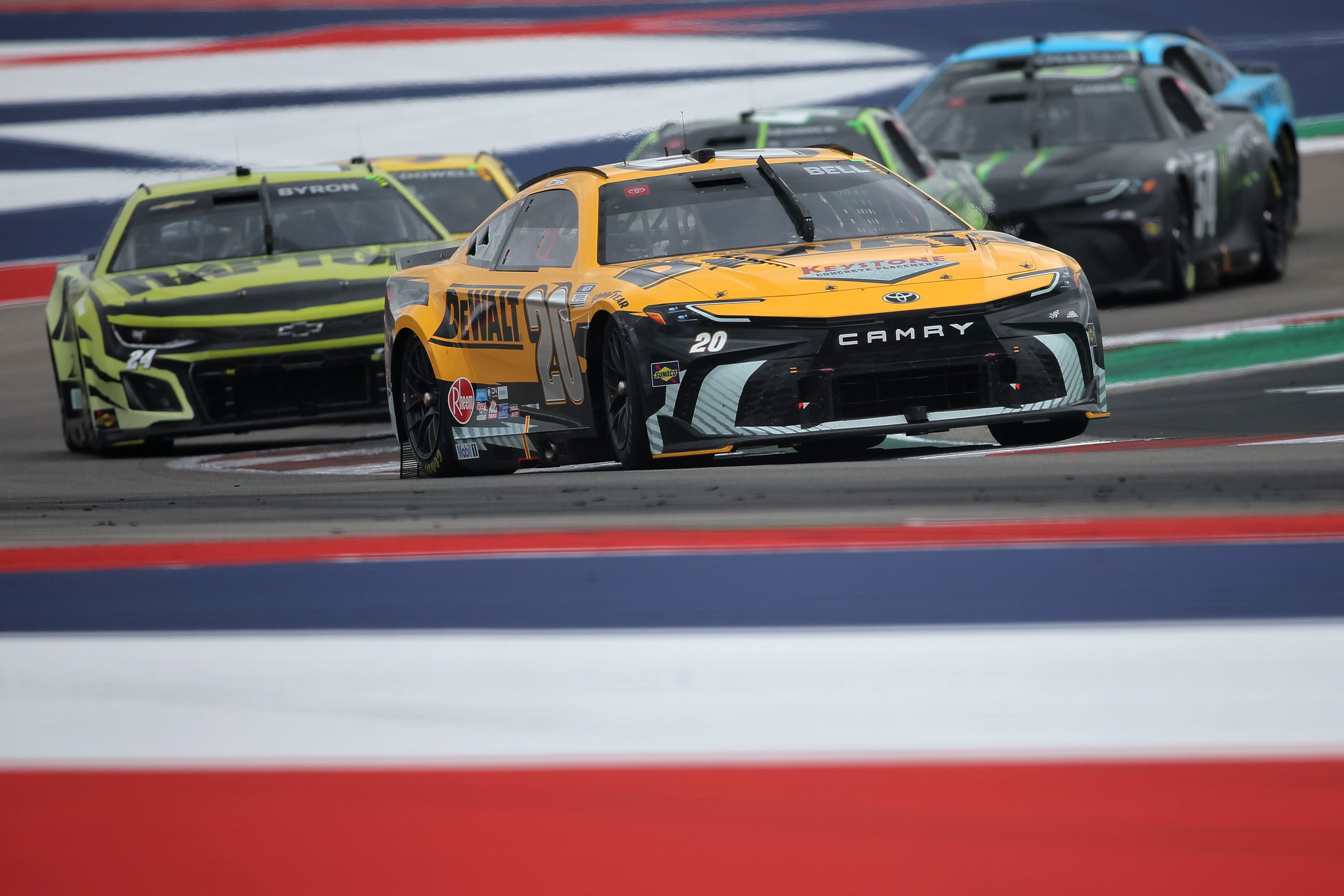 AUSTIN, TEXAS - MARCH 24: Christopher Bell, driver of the #20 DEWALT Toyota, and William Byron, driver of the #24 RaptorTough.com Chevrolet, race during the NASCAR Cup Series EchoPark Automotive Grand Prix at Circuit of The Americas on March 24, 2024 in Austin, Texas. (Photo by Jonathan Bachman/Getty Images)