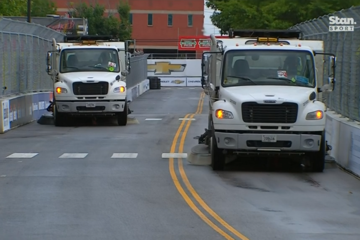 Race cars being towed into pit lane; IndyCar officials aiming for session start of 18:00 ET/08:00 AEST.