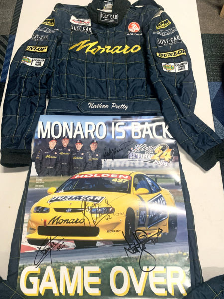 Pretty has offered up his original driving suit from the inaugural Bathurst 24-hour race which he won in the famous No.427 seven-litre Holden Monaro with Garth Tander, Steve Richards, and Cameron McConville in 2002.
