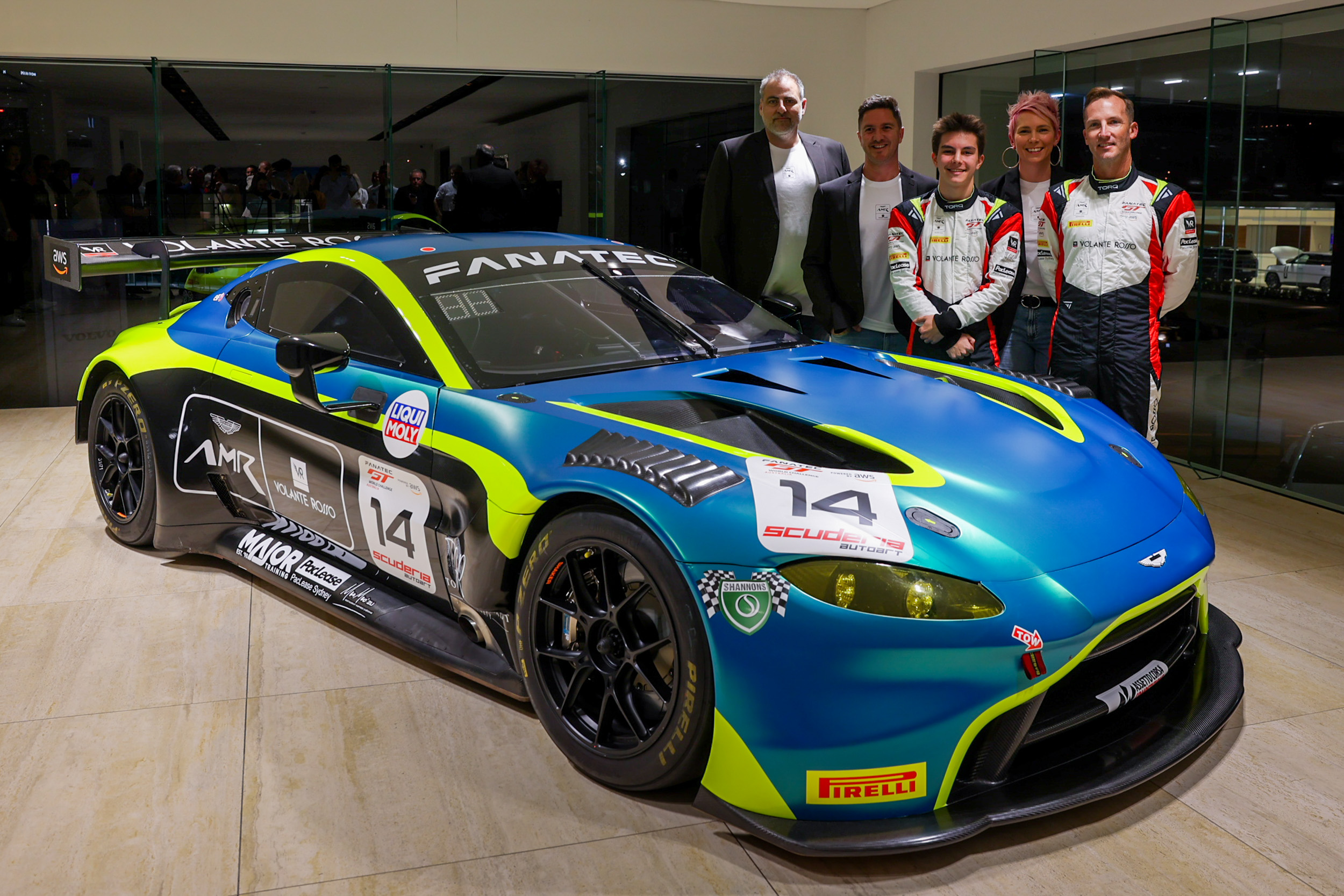 The car was formally unveiled on the Gold Coast this evening, sporting Aston Martin Racing signage as part of a factory tie-up with Volante Rosso.