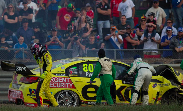 The #80 ekol Commodore of Scott Pye suffered a massive front-on accident when it careened into the Turn 2 wall at high speed after the brakes failed during the Symmons Plains round more than a week ago.