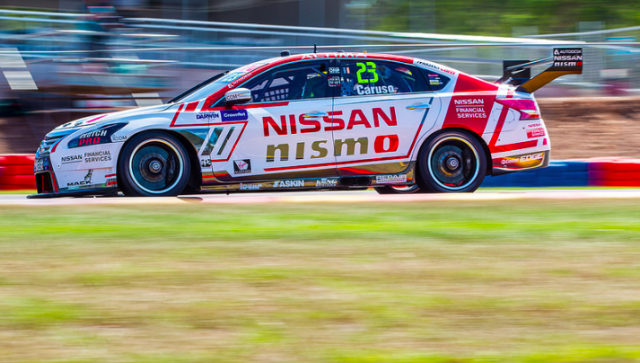 Nissan’s Michael Caruso became the 10th different winner of the 2016 Supercars season after pole-sitter Shane van Gisbergen fell foul of a restart penalty.