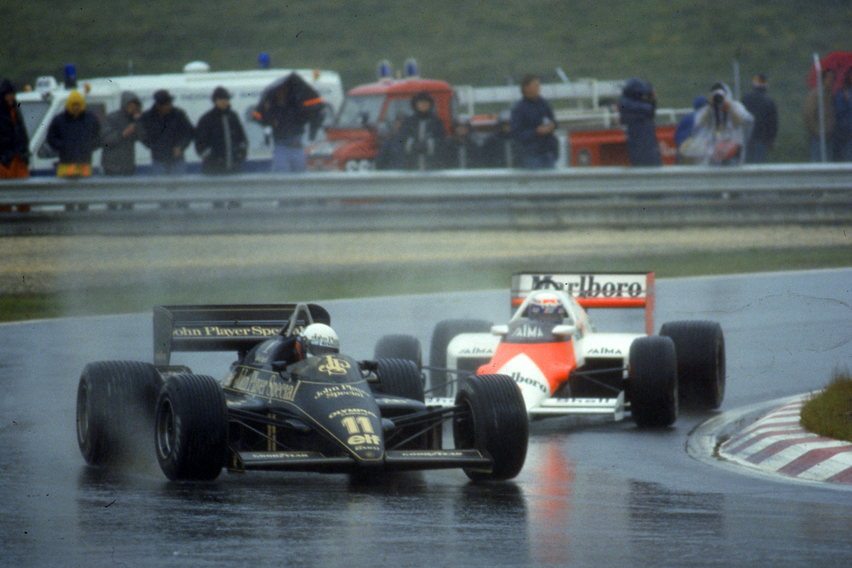 Ayrton Senna en route to his first F1 race win|Elio de Angelis (ITA) Lotus 97T Renault leads Alain Prost (FRA) McLaren MP4/2B Tag Porsche – www.xpbimages.com