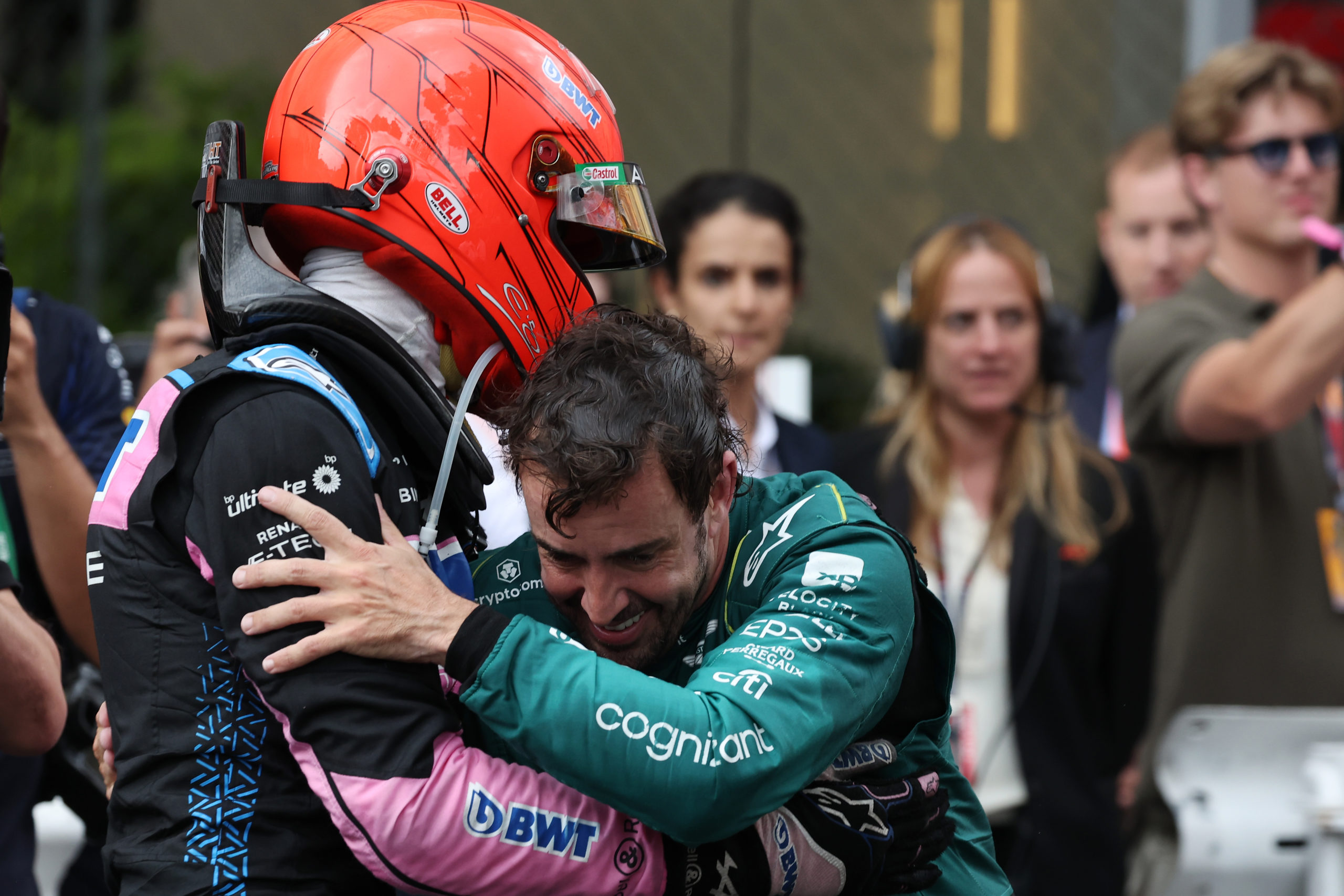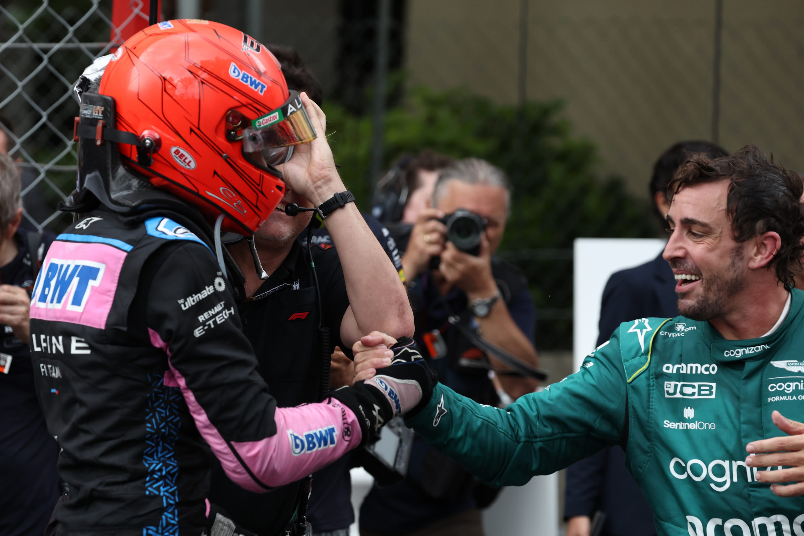 Esteban Ocon (FRA) Alpine F1 Team celebrates his third position in parc ferme with second placed Fernando Alonso (ESP) Aston Martin F1 Team.
