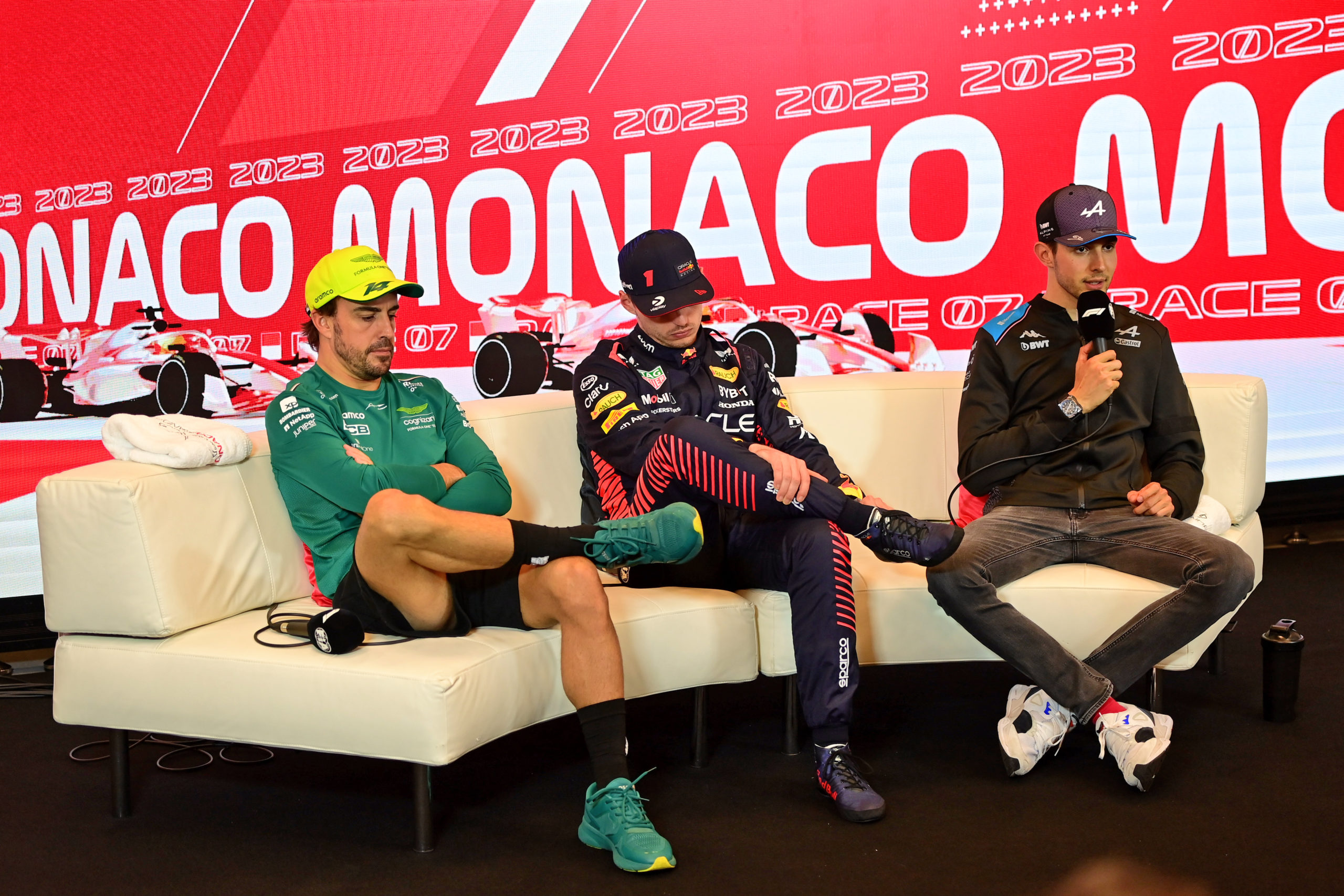 The podium (L to R): Fernando Alonso (ESP) Aston Martin F1 Team, second; Max Verstappen (NLD) Red Bull Racing, race winner; Esteban Ocon (FRA) Alpine F1 Team, third.