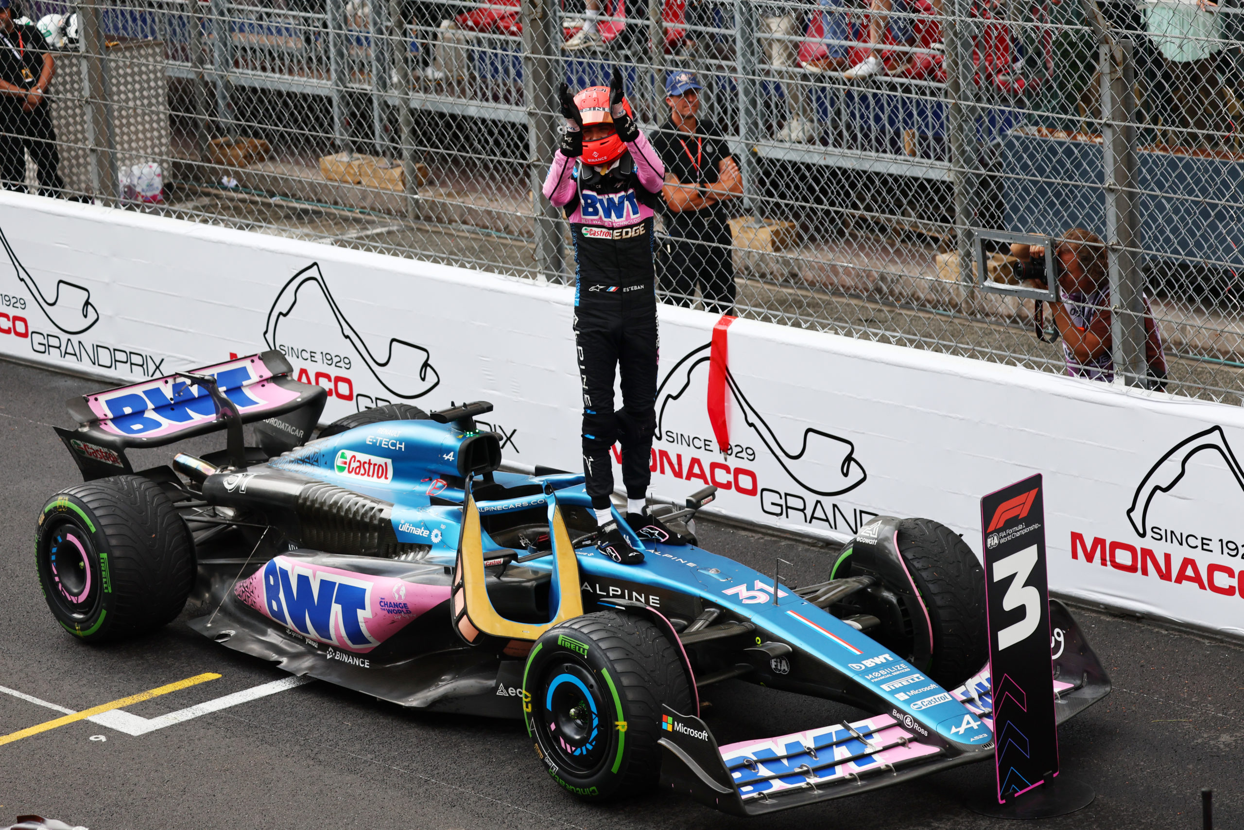 Esteban Ocon (FRA) Alpine F1 Team celebrates his third position.