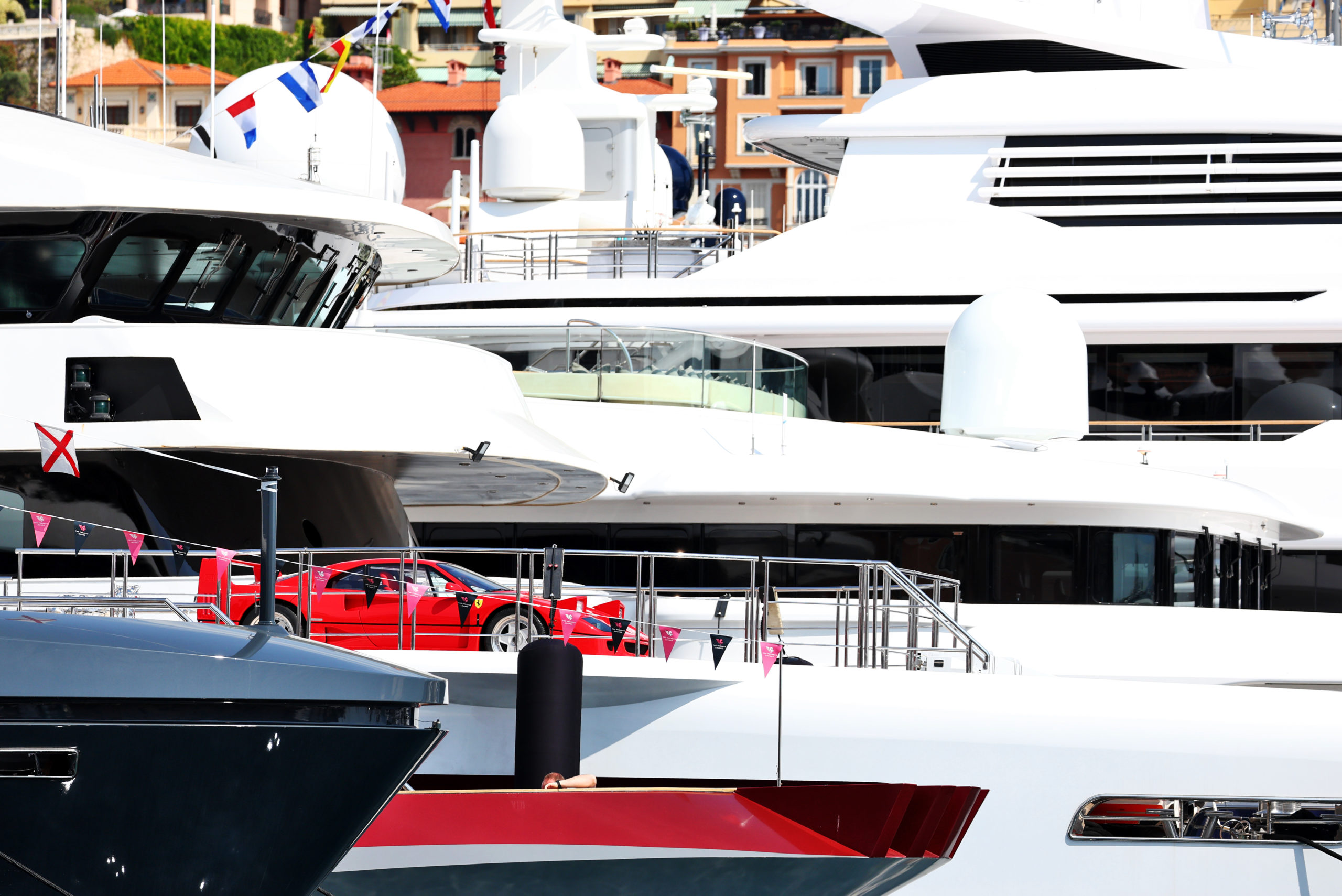 A Ferrari F40 on a boat in the Monaco Harbour.
