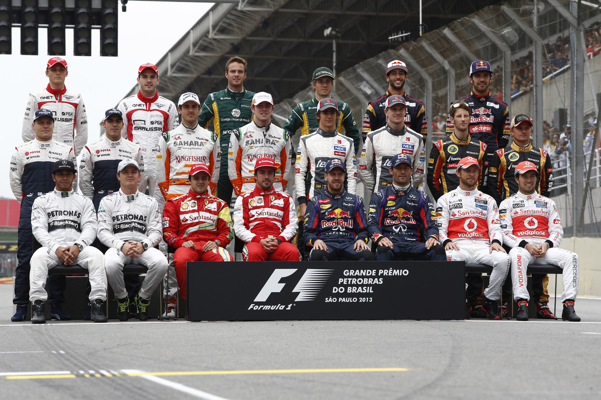The drivers end of season group photograph (From back row (L to R)): Jules Bianchi (FRA) Marussia F1 Team; Max Chilton (GBR) Marussia F1 Team; Giedo van der Garde (NLD) Caterham F1 Team; Charles Pic (FRA) Caterham; Daniel Ricciardo (AUS) Scuderia Toro Rosso; Jean-Eric Vergne (FRA) Scuderia Toro Rosso; Valtteri Bottas (FIN) Williams; Pastor Maldonado (VEN) Williams; Adrian Sutil (GER) Sahara Force India F1; Paul di Resta (GBR) Sahara Force India F1; Esteban Gutierrez (MEX) Sauber; Nico Hulkenberg (GER) Sauber; Romain Grosjean (FRA) Lotus F1 Team; Heikki Kovalainen (FIN) Lotus F1 Team; Lewis Hamilton (GBR) Mercedes AMG F1; Nico Rosberg (GER) Mercedes AMG F1; Felipe Massa (BRA) Ferrari; Fernando Alonso (ESP) Ferrari; Sebastian Vettel (GER) Red Bull Racing; Mark Webber (AUS) Red Bull Racing; Jenson Button (GBR) McLaren; Sergio Perez (MEX) McLaren. 24.11.2013. Formula 1 World Championship, Rd 19, Brazilian Grand Prix, Sao Paulo, Brazil, Race Day. – www.xpbimages.com, EMail: [email protected] – copy of publication required for printed pictures. Every used picture is fee-liable. © Copyright: Photo4 / XPB Images