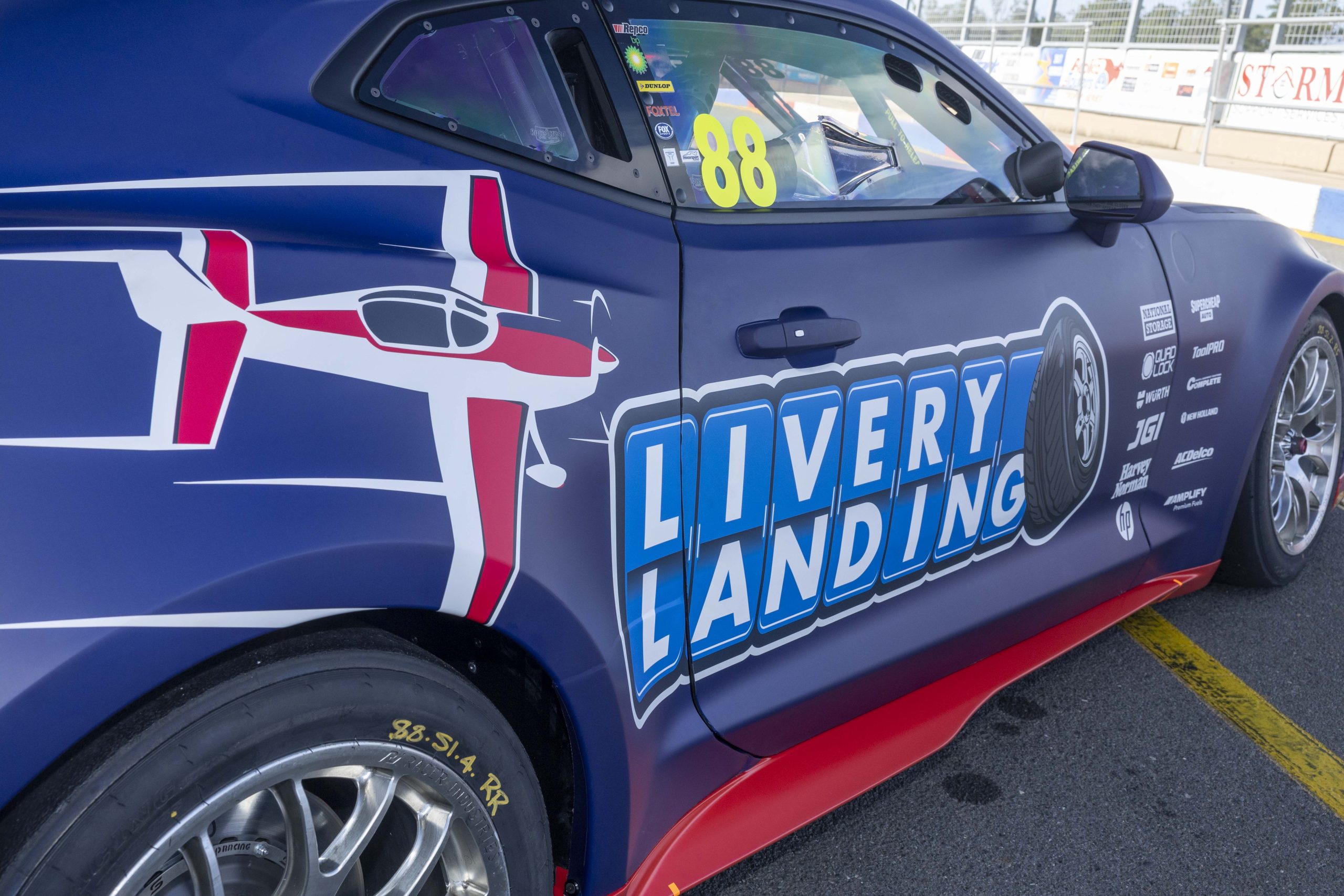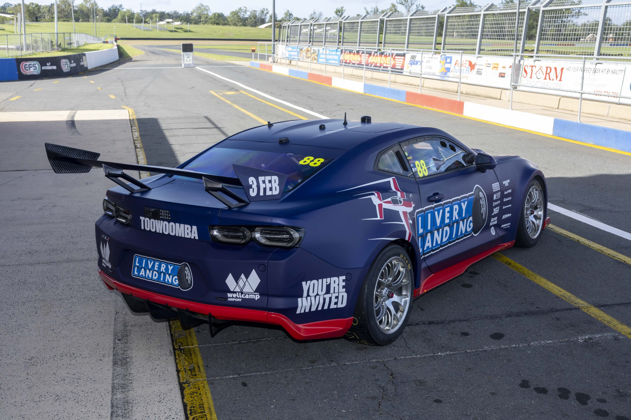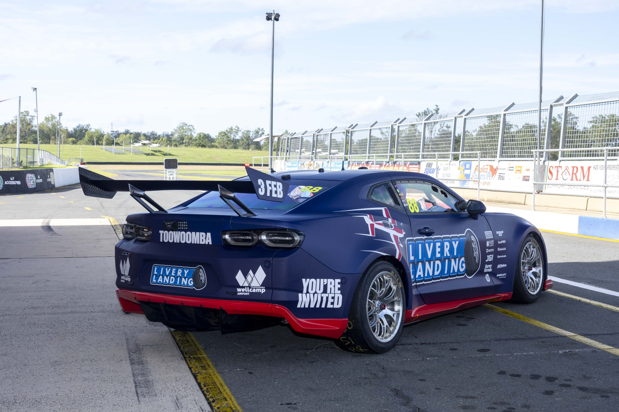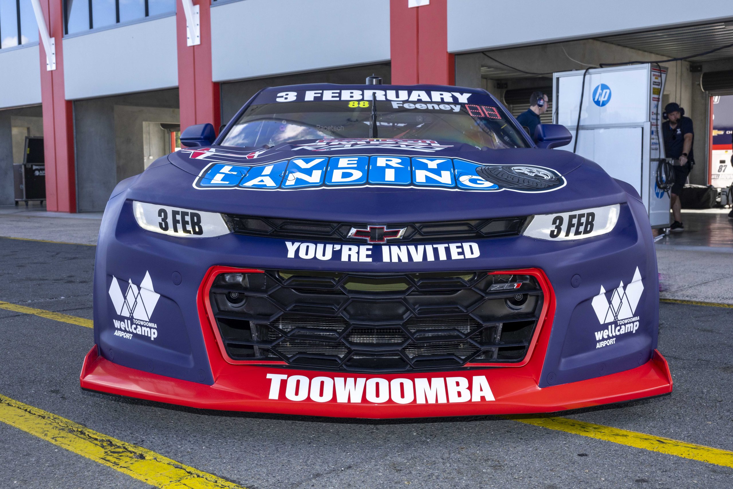 The Triple Eight Race Engineering Chevrolet Camaro Supercars are publicising its upcoming ‘Livery Landing’ at Toowoomba Wellcamp Airport during today’s shakedown at Queensland Raceway.