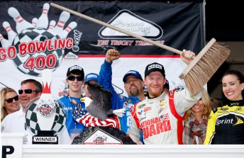 Dale Earnhardt J. has beaten home Kevin Harvick to score back-to-back wins at Pocono this year.
