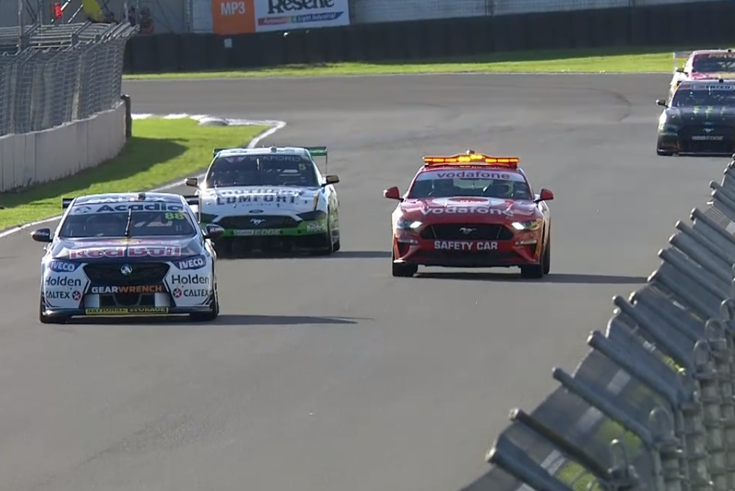 The Triple Eight driver then chose to pass the Safety Car without permission to attempt to regain his track position while, behind him, early race contenders Lee Holdsworth, Cameron Waters, Fabian Coulthard and Will Davison stayed put.