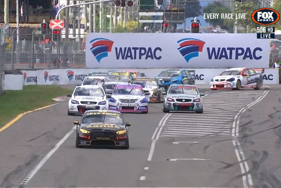 On the second occasion, he powered the #5 Tickford FGX Falcon away from the field exiting the second-last corner of the circuit, causing the field to bunch up when some appeared to have initially followed his cue.