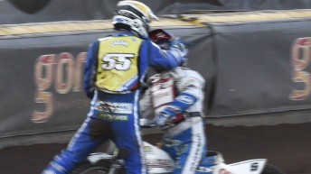 After Zagar remonstrated with the three-times World Champion on track, Pedersen kicked the Slovenian below the belt before storming off the track.