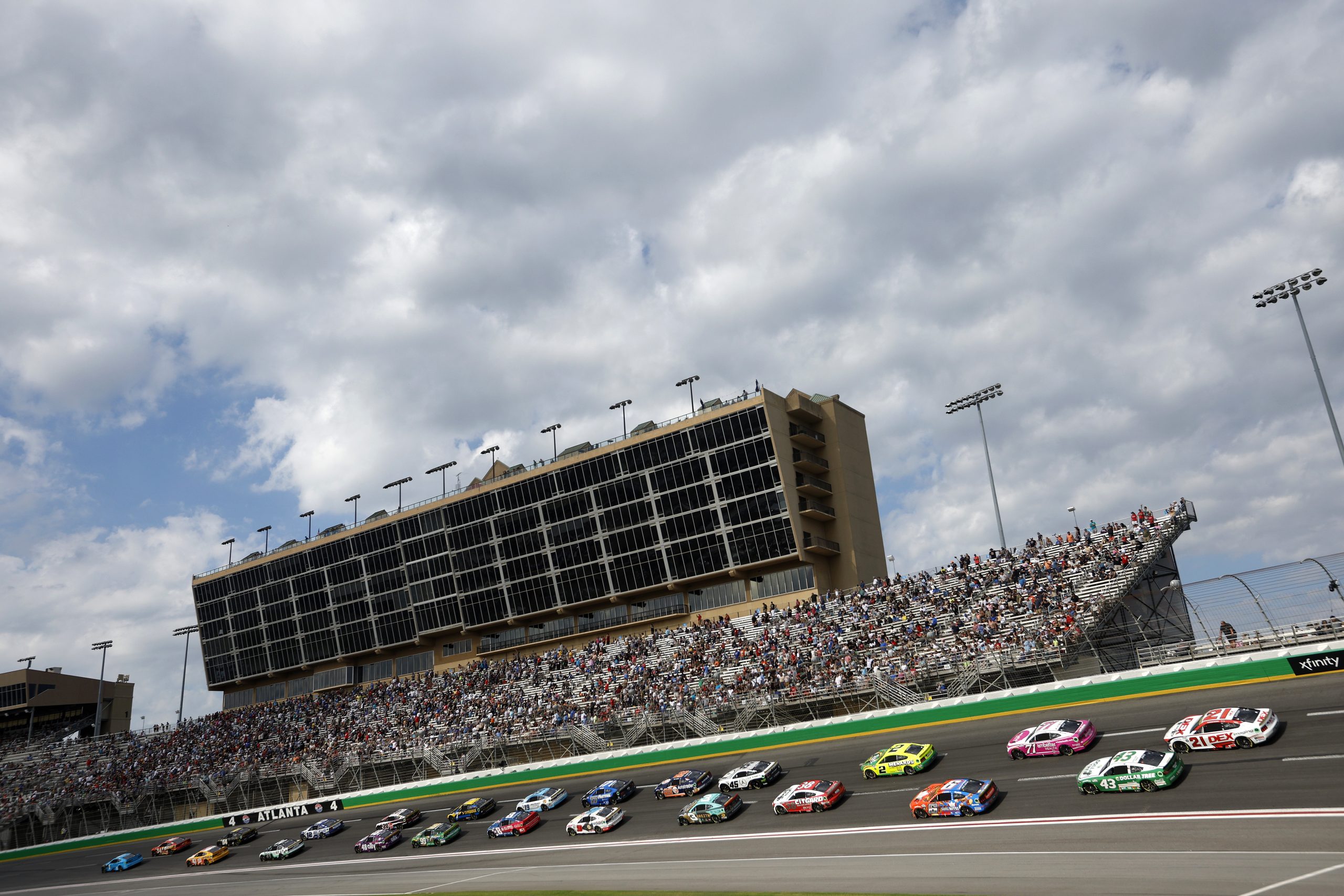 The Atlanta oval is 2.48kms in length and very steeply banked at each end. It’s flat out in both categories of car, given that the restrictor plate motors are run at this venue. A lap time is just over 30 seconds, so the cars are running around 280 km/h all the time.