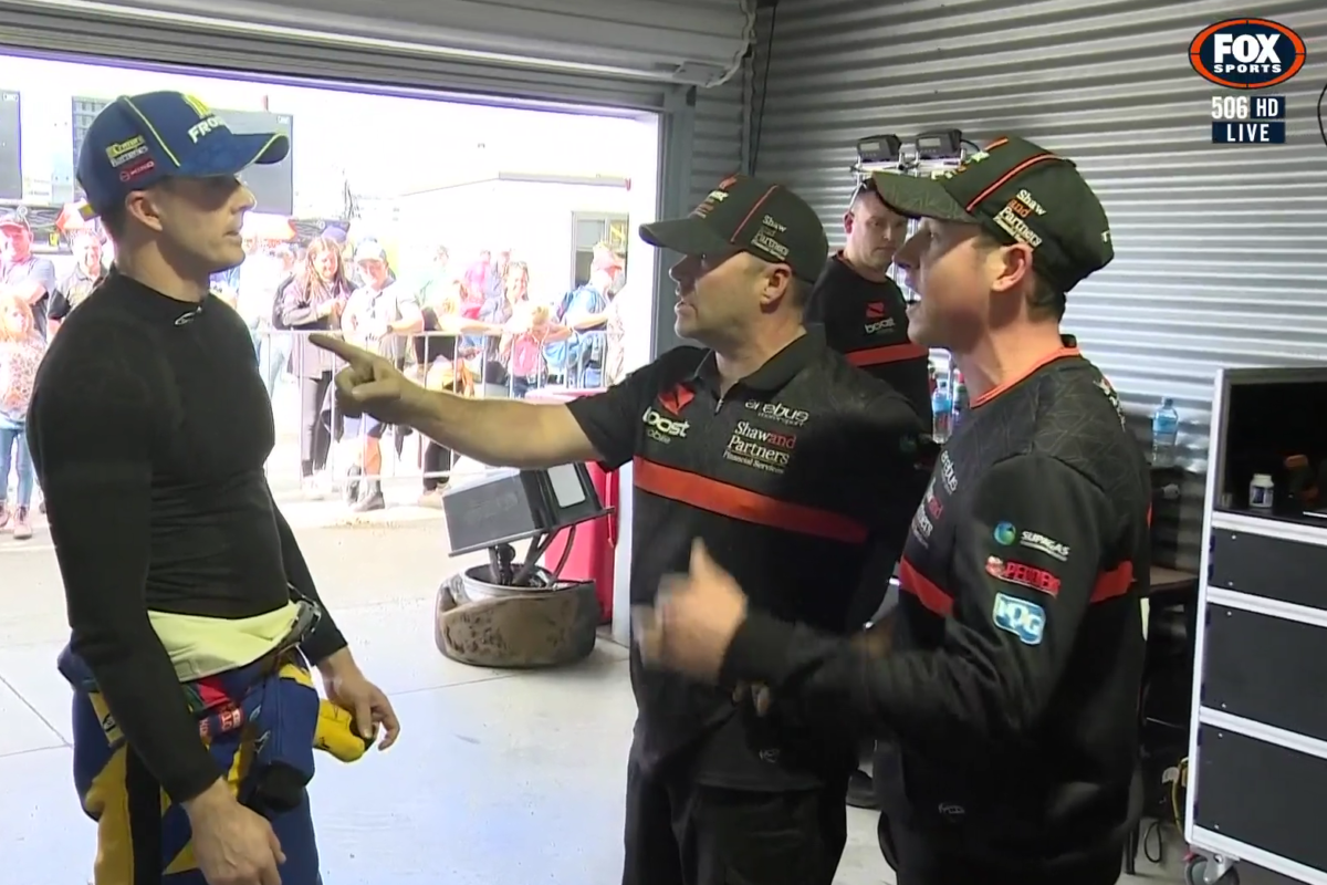 A broadcast camera captured the Erebus CEO pushing Winterbottom after the Team 18 driver entered the garage following his incident with Will Brown in Race 28 of the Repco Supercars Championship at the ITM Auckland SuperSprint.