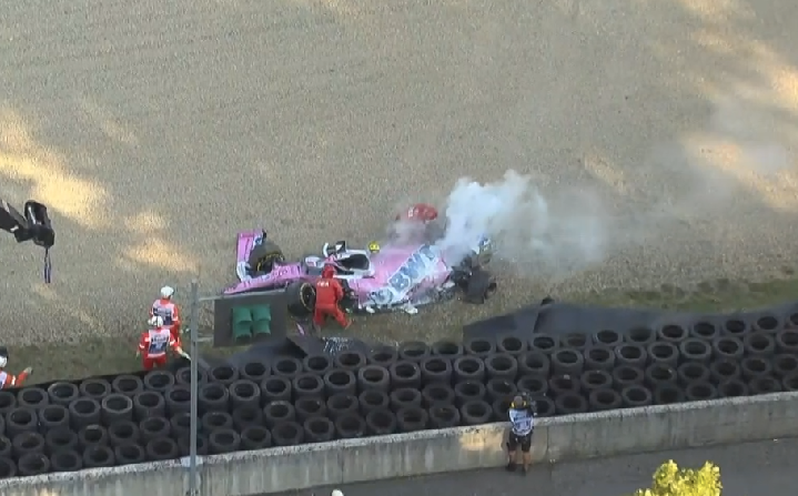 The Racing Point spun at high speed through the gravel before making heavy contact with the tyre barrier.