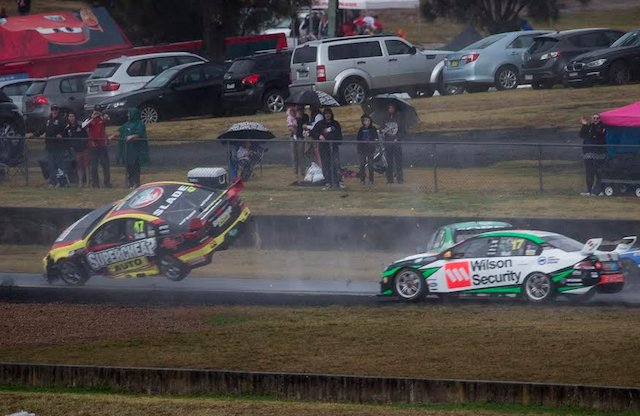 The right-front corner of Slade’s car clipped the stranded Ford Performance Racing Falcon on the exit of Turn 3 on the opening lap, spectacularly sending the former onto two-wheels.