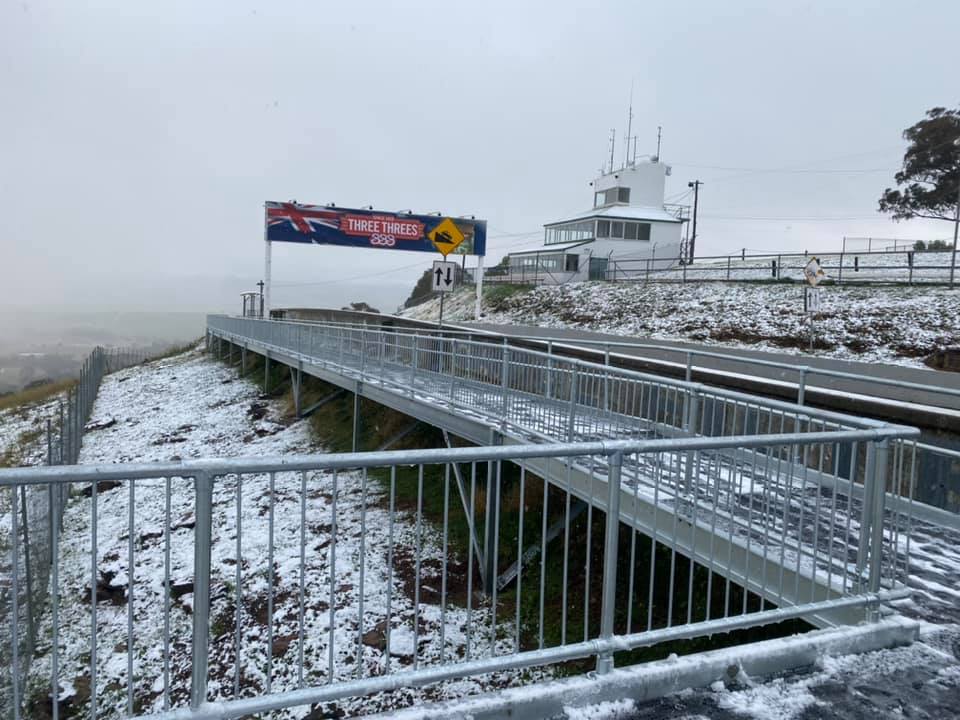 Mount Panorama was pictured with a white dusting in a photo posted by the NSW SES Bathurst Unit Facebook page on Saturday morning.