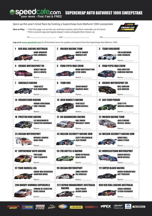 In keeping with the spirit of the car race that stops a nation, Speedcafe.com has designed an exclusive sweep chart for the Supercheap Auto Bathurst 1000.