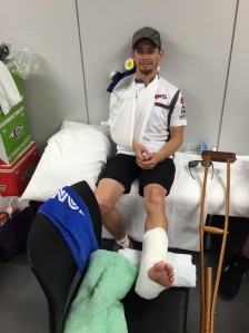The two-time MotoGP World Champion Tweeted: Well my #Suzuka8H ended spectacularly! Stuck Throttle = Broken Scapula + Fractured Tibia and a few more tweaks. Sucks! Sorry to my team Michael van der Mark, Takumi Takahashi and the entire crew, they have worked too hard to end it like that. Thank you guys!”