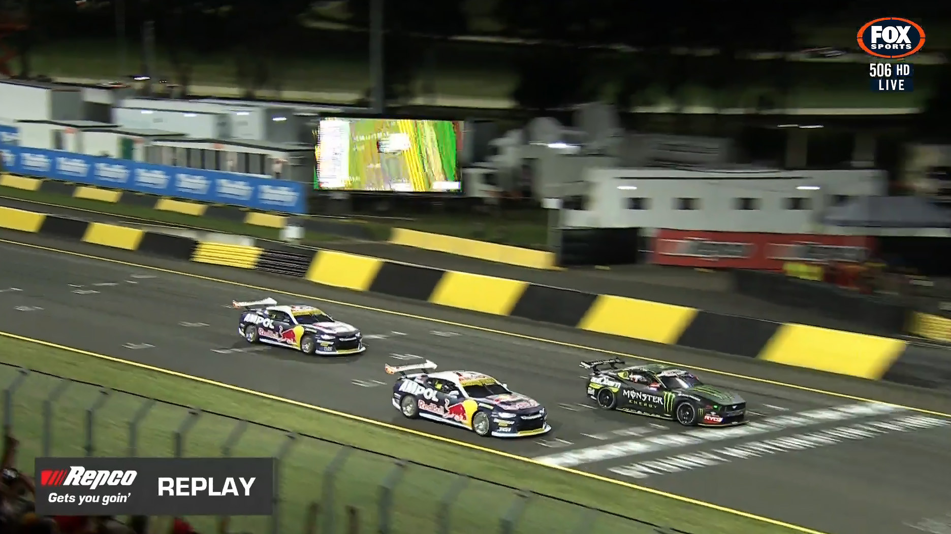 The Monster Mustang arrived on the back of Feeney with four laps to go and promptly turned the Red Bull Camaro around at Turn 4.