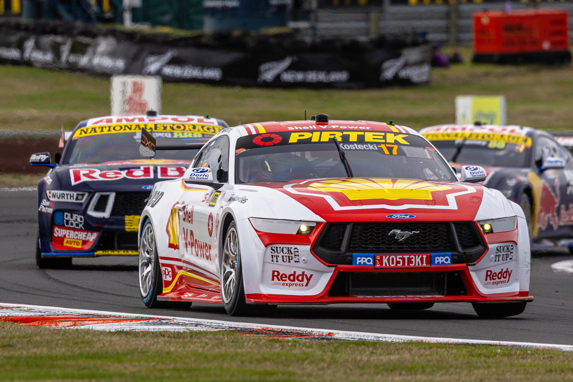 At the start, Kostecki’s Mustang squirmed off the line with wheel spin. He drove deep into Turn 1, which forced Broc Feeney to go wide.