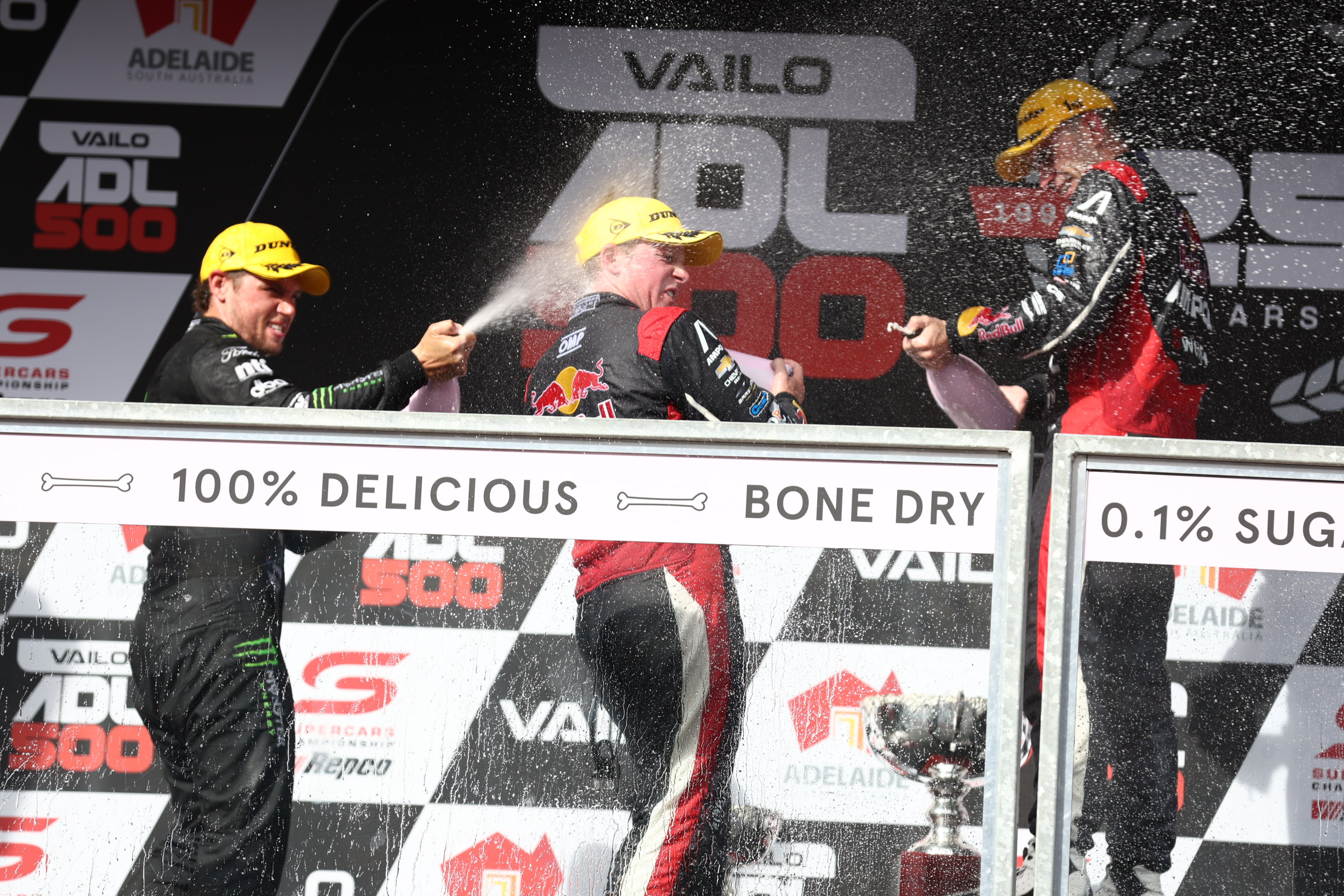 The issue was that the top three were supposed to pull up on the front straight after the race, however they all pulled into pit lane instead.