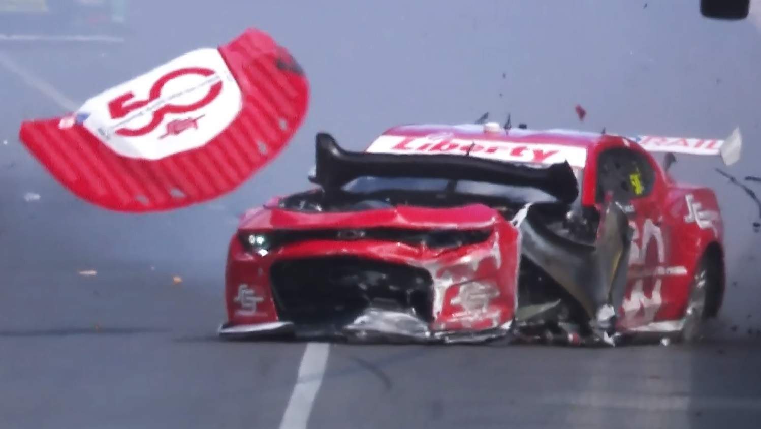 The crash will almost certainly rule Evans out of the weekend with enormous damage to front of the #50 Chevrolet Camaro.
