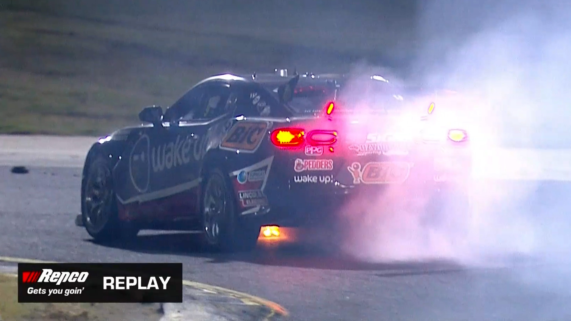 The #5 Falcon of Chris Kneafsey sliding off the road on his own oil, setting off a chain reaction behind. Image: SBS On Demand