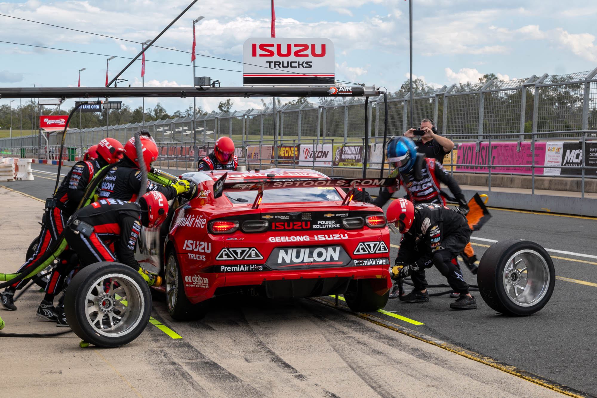 PremiAir shared Queensland Raceway on Monday with a Triple Eight Camaro and Blanchard Racing Team Mustang, both performing engine testing ahead of the Great Race.