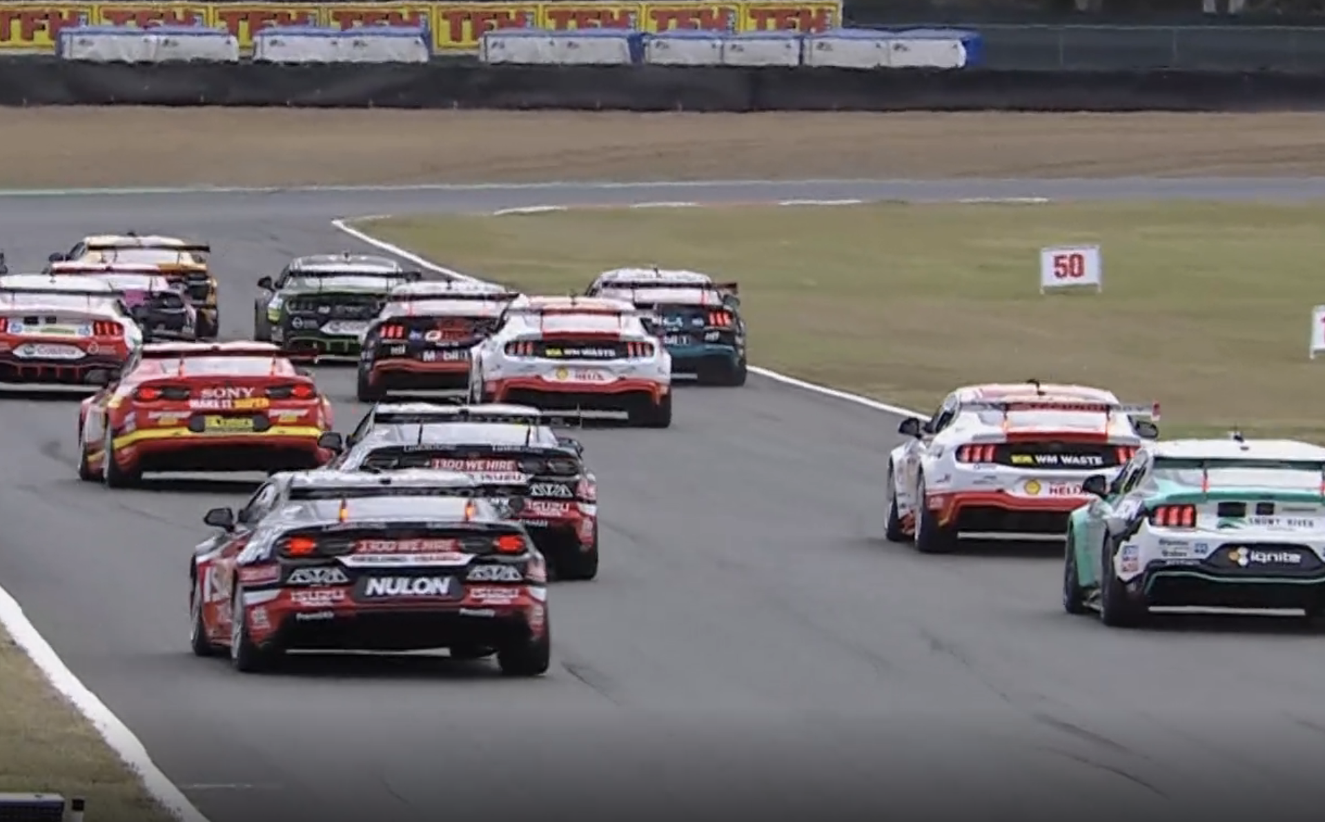 A jostle for track position included cars running three-wide down the back straight and Cam Waters making minor contact with Kai Allen.