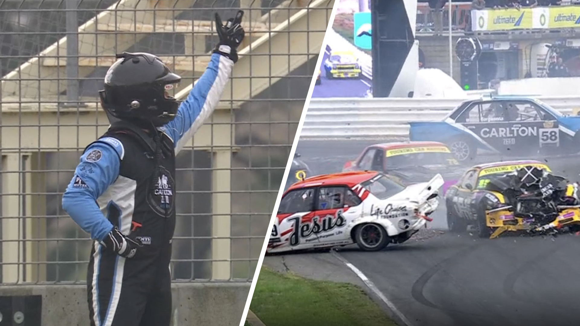 The cars of Jude Bargwanna (Holden Commodore), Andrew Fisher (Holden Torana) and Scott Cameron (Chevrolet Camaro) all suffered big damage in the race-stopping shunt.