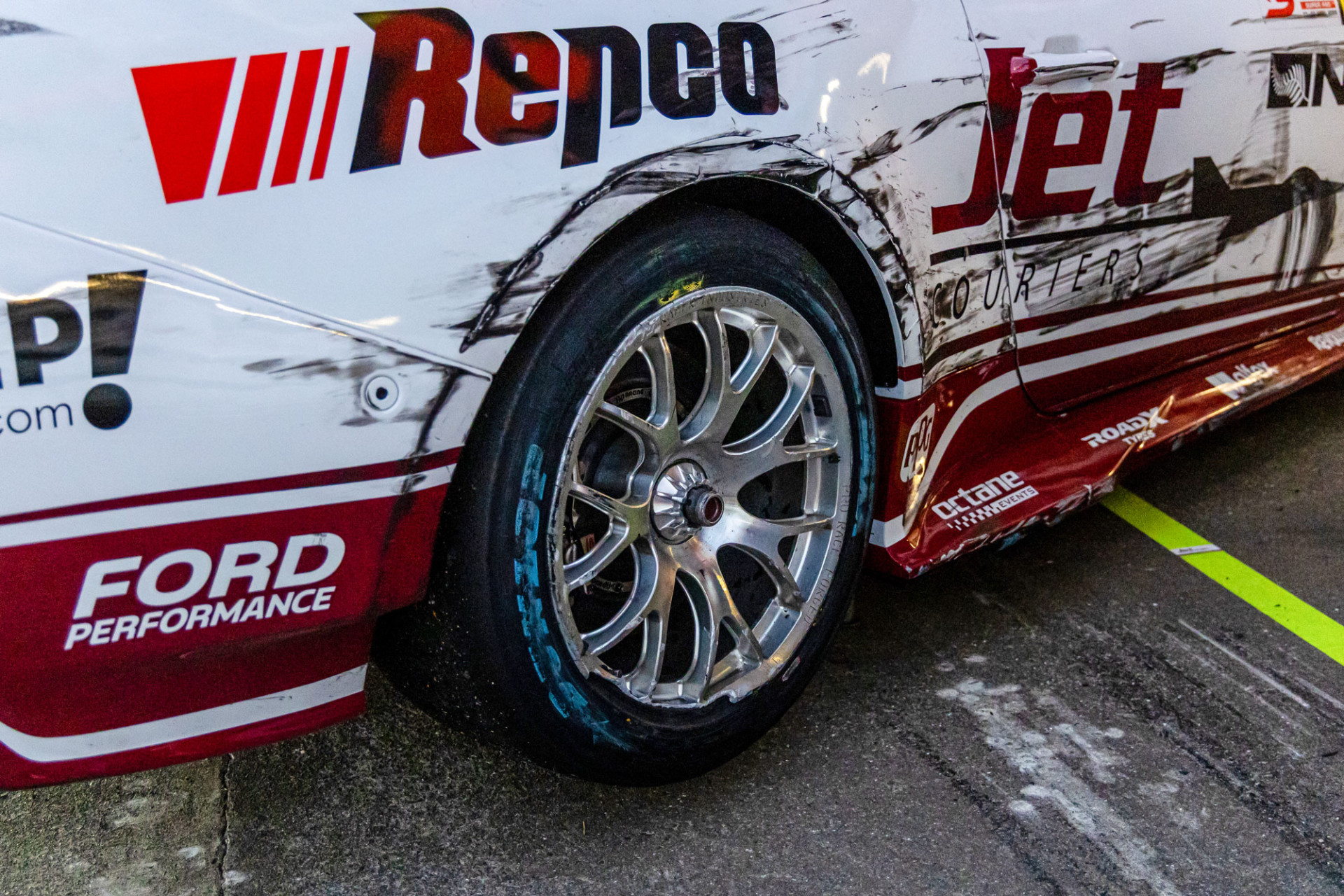 The two Ford Mustangs ended Saturday’s second sprint with wheel damage following interlocking between spokes during contact.