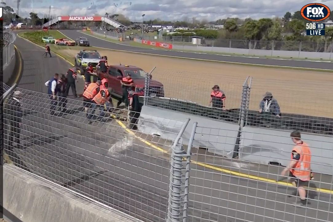 Race 28 of the Repco Supercars Championship at Pukekohe has been red-flagged due to a damaged pit wall.