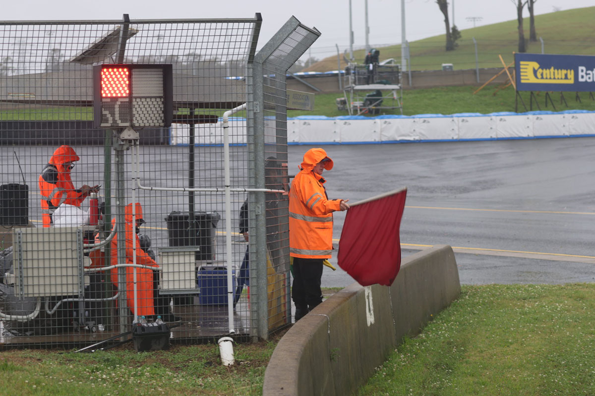 “Red flag, red flag, red flag,” announced race director Tim Schenken over the radio.