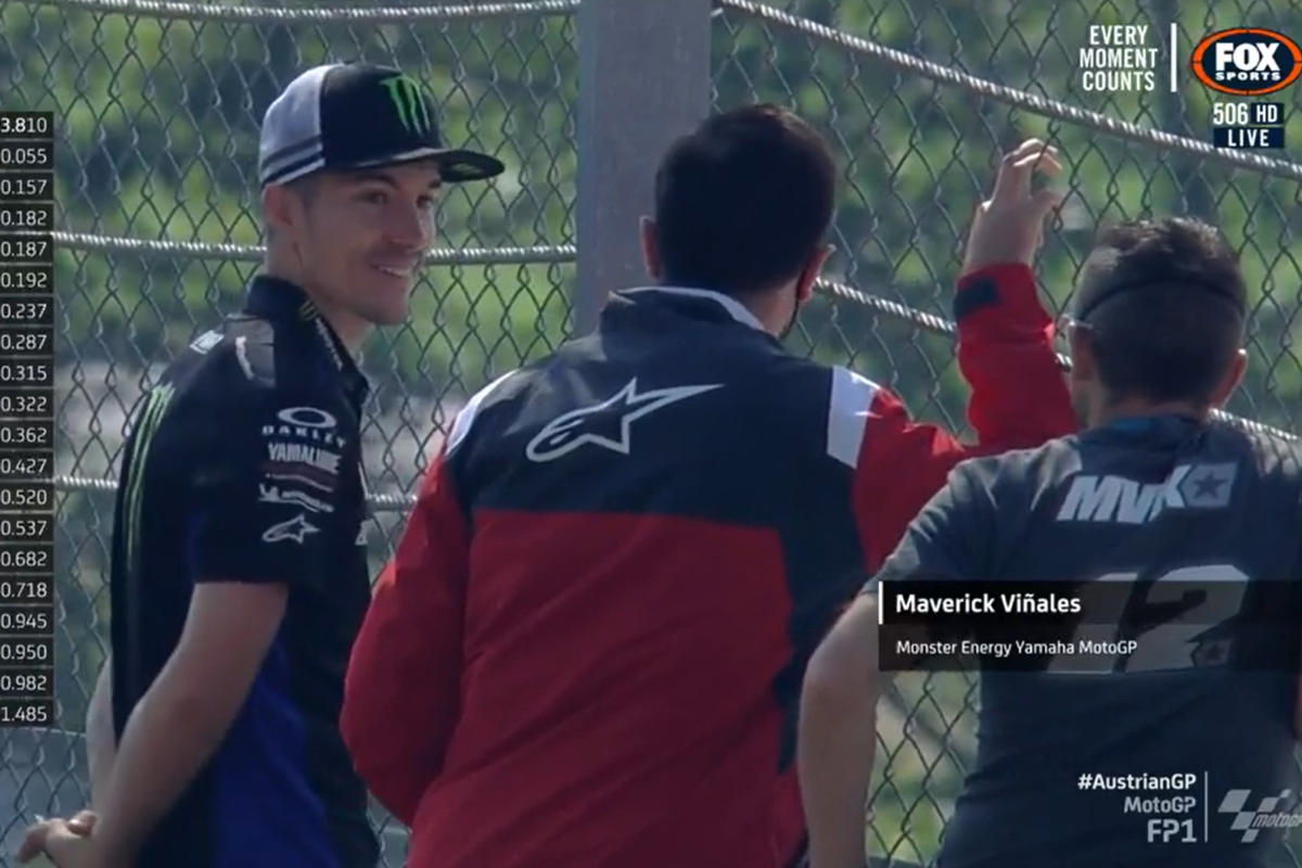 Viñales was spotted on the television world feed watching Free Practice 1 for the Austrian Grand Prix through a fence at Turn 3, while wearing his Monster Energy Yamaha apparel, with two others.