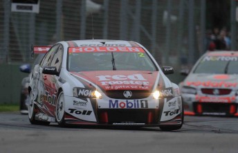Tander made the best get-away at the start and beat yesterday’s race winner James Courtney to the first corner. The Toll Holden Racing Team driver proceeded to lead every lap of the race, but not without a late challenge from TeamVodafone’s Jamie Whincup, who clawed his way from fifth to second by race’s end.