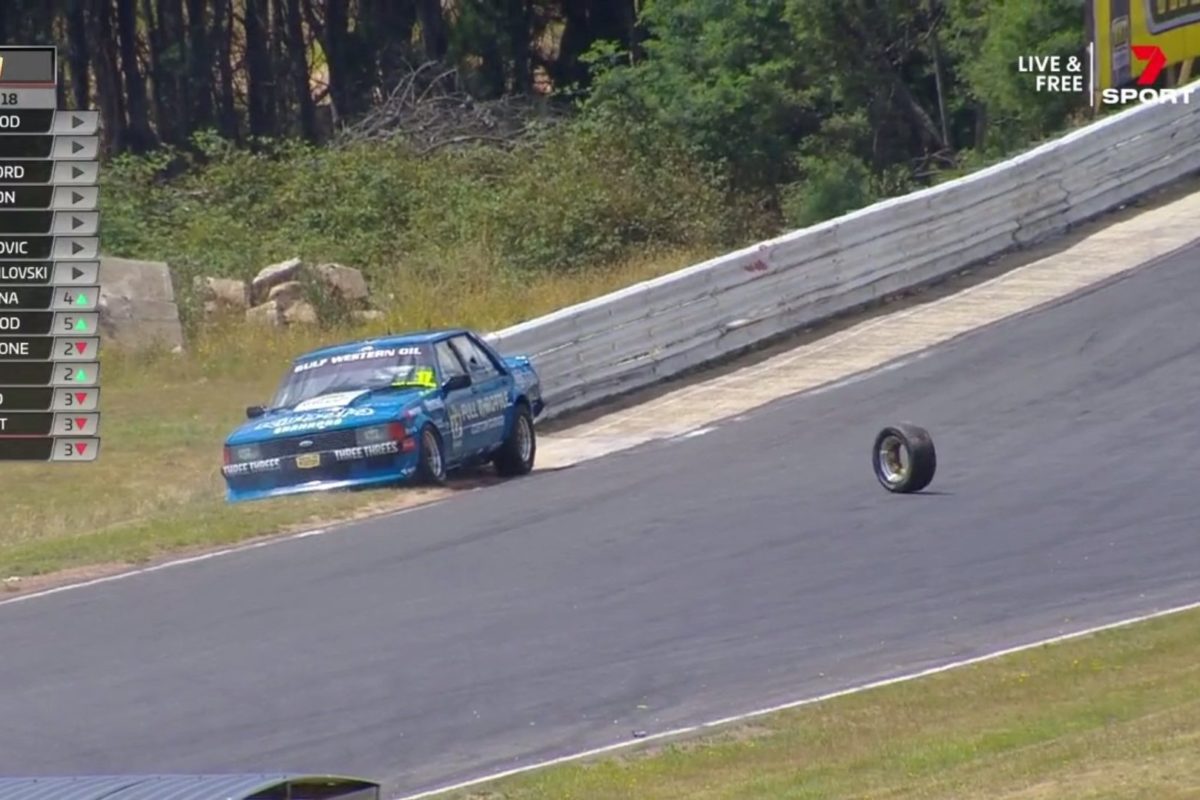 Race 2 of Round 1 of Gulf Western Oils Touring Car Masters at Symmons Plains has been red flagged after Steven Johnson’s XD Falcon sheared a wheel off.