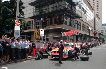Compete with a full race set-up, Jamie Whincup roared through the Brisbane streets before completing a pitstop in front of surprised on-lookers, handing his car over to his endurance co-driver Andrew Thompson.