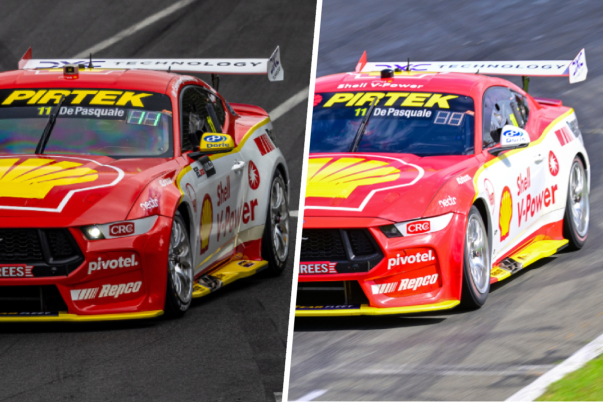 A comparison of the #11 DJR Ford Mustang at Adelaide in November 2023 (left) and Queensland Raceway last week (right)