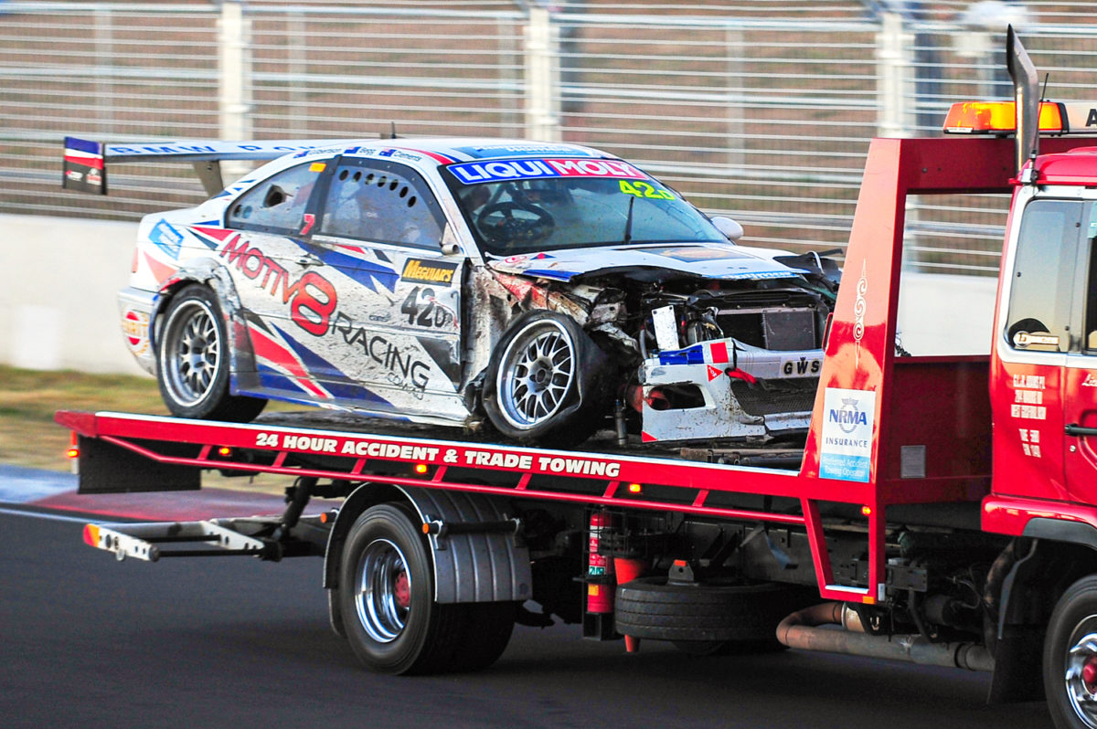 “I remember steering left and it collected the front right side of the car. The impact took out my front right wheel, took the brake line off the wheel, the Carbon Fibre Bonnet split and flipped up and cracked on the engine mounts off the block.