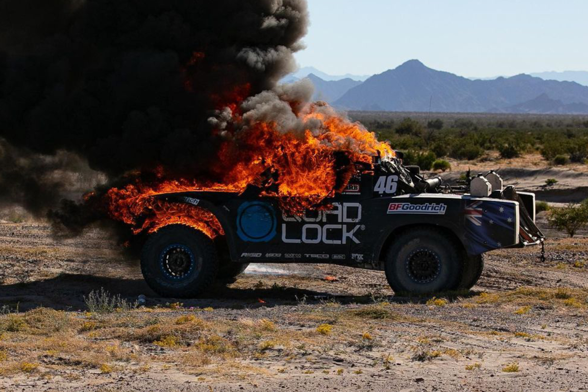 Footage has emerged on social media of their #46 Trophy Truck engulfed in flames.