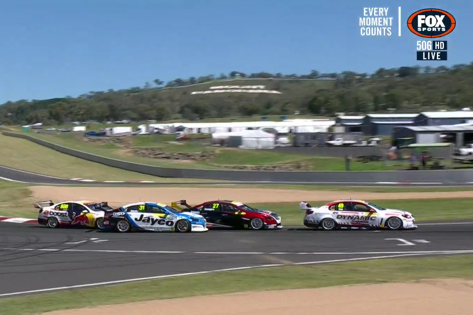 With Everingham stuck behind the #49 VF Commodore, his team-mate Ojeda sought to capitalise by going to the outside.