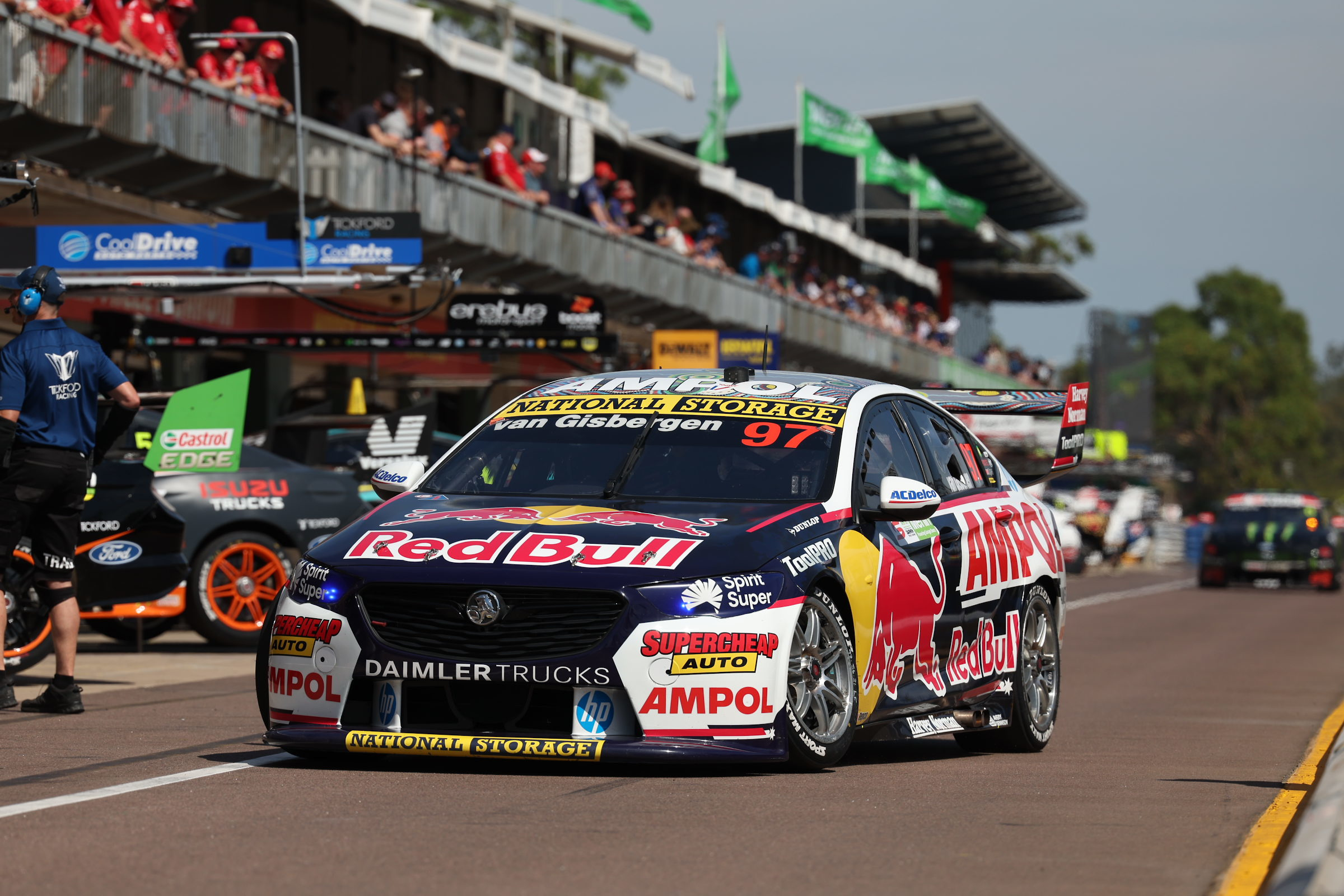 Shane van Gisbergen had been leading Race 12 the Merlin Darwin Triple Crown when he brought his #97 Holden ZB Commodore to the pits on Lap 22 for his sole tyre change.